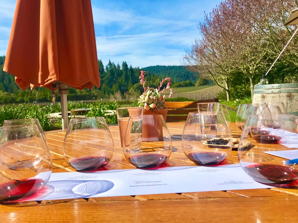 If you love Pinot Noir and sweeping vineyard views, then Goldeneye is the perfect place to visit for a tasting. While the location is close to other wineries, the environment feels remote and the colorful landscaping serves as a peaceful backdrop for a wine tasting. The tasting includes several Pinot Noirs made from grapes grown in the varying climates and soils of the Anderson Valley. The subtle differences make it hard to choose a favorite!