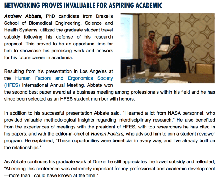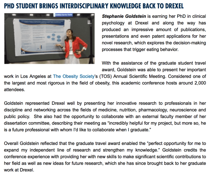 To complement an email campaign I developed targeting donors and prospective donors for a new conference travel fund for graduate students, I put together a social media campaign celebrating the previous awardee experiences and encouraging participation in an upcoming fundraising event.