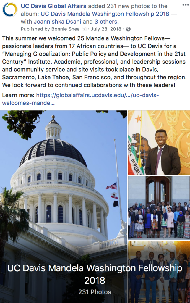 Managing a team of student photographers, writers and communications assistants, I provide robust communications planning and implementation for fellowships and other programs, including social media coverage. For the six-week Mandela Washington Fellowship, we provided high-quality photography, live Tweets, Instagram stories and fellow “take-overs,” and Facebook posts for signature events to go alongside web stories and features. This particular fellowship coverage led to the highest web and social traffic and engagement ever for the organization.